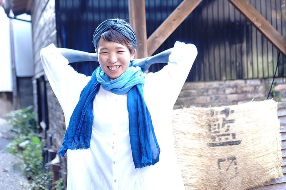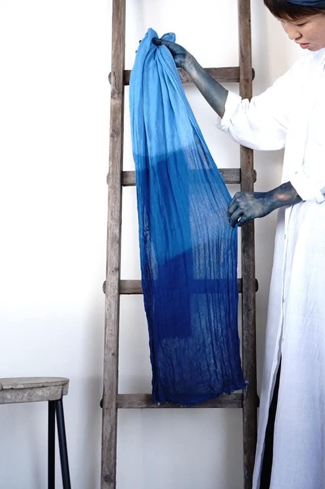 天然の藍で、1点1点手染めをしています。時にはムラや線が生じることがありますが、